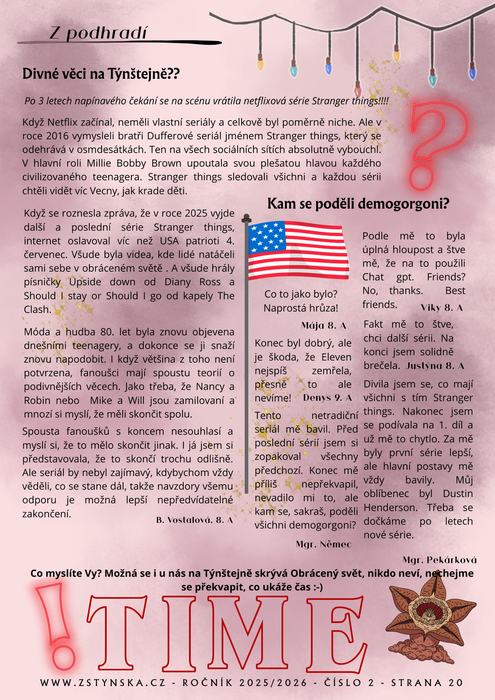 Další číslo školního magazínu Týnštejn je tady Týnštejn č. 6 - únor 2026 velký barevný malý.pdf najdete tu hokejovou hvězdu z Týnské, lyžák, Stranger things, rozhovory a mnoho dalšího.
