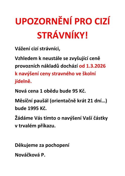 vzhledem k neustále se zvyšující ceně provozních nákladů dochází od 1.3.2026 k navýšení ceny stravného ve školní jídelně.