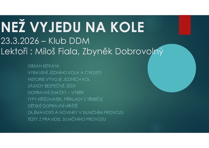V pondělí 23.3 se děti z kroužku Dopraváček zúčastnily besedy na téma Než vyjedu na kole. Beseda se konala v klubu DDM na Komenského náměstí v Třebíči a děti získaly spoustu užitečných informací k tématu od p. Miloše Fialy a Bc. Zbyňka Dobrovolného.